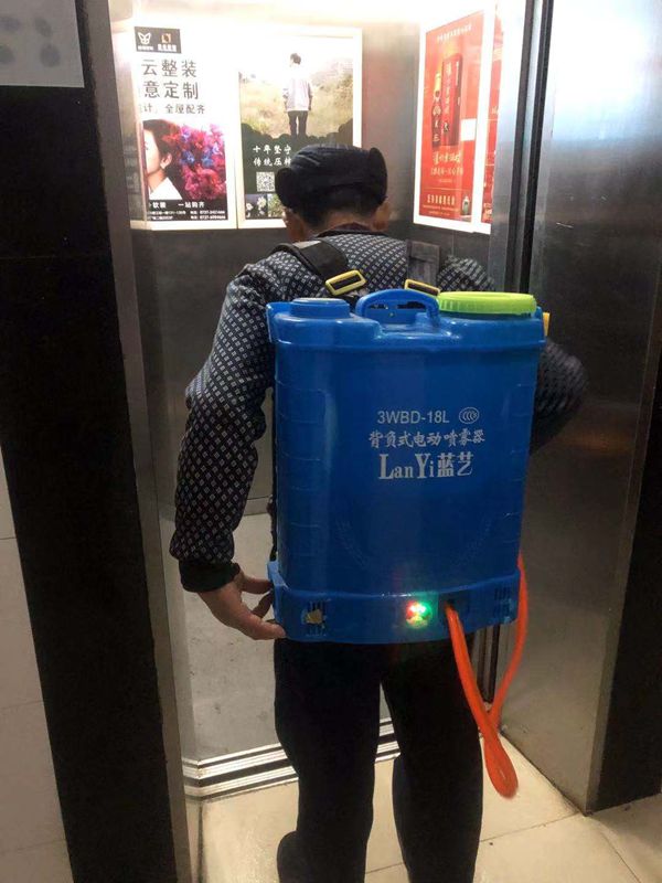 圖為物業(yè)公司給小區(qū)電梯進(jìn)行消毒