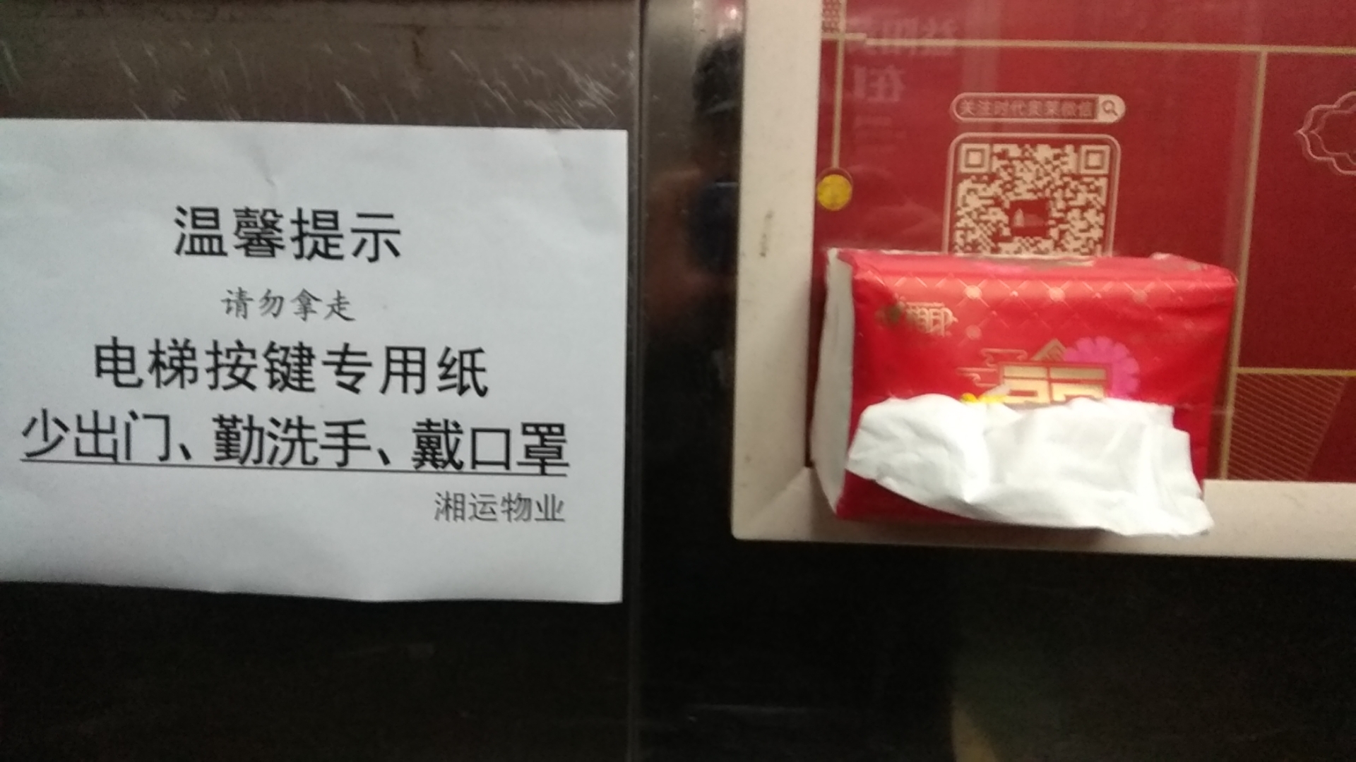 2月1日,在益陽(yáng)市桃花里小區(qū)的電梯里,出現(xiàn)了一張醒目的“溫馨提示”A4紙,旁邊安放了一盒抽紙巾。這是湘運(yùn)物業(yè)服務(wù)管理公司細(xì)心防控疫情的有力措施。根據(jù)電梯空間小、封閉嚴(yán),一旦有病毒極易被感染的情況,公司經(jīng)理袁笑當(dāng)天一早就安排值班人員采購(gòu)、準(zhǔn)備好了相關(guān)物資,并第一時(shí)間落實(shí)到位。截止當(dāng)天12:00,桃花里小區(qū)21臺(tái)電梯里都有了如圖所示的便民抽紙。